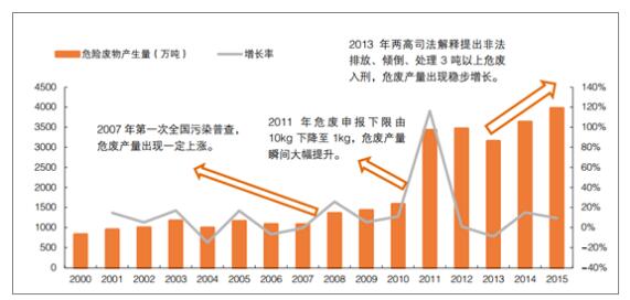 4、危廢産量巨大(dà),政策監管驅動,需求逐步釋放(fàng)。與生(shēng)活垃圾成熟的處理(lǐ)模式相(xiàng)比,我國(guó)危廢處理(lǐ)行業仍處于成長階段。從(cóng)行業發展來(lái)看(kàn),大(dà)多數産廢企業危廢産量有限,但(dàn)由于危廢處理(lǐ)成本較高,再加上過去(qù)監管缺失,隐藏、傾倒、丢棄相(xiàng)對容易,瞞報、漏報現象嚴重,導緻危廢處理(lǐ)需求得(de)不到有效釋放(fàng)。我們估計(jì),目前我國(guó)每年(nián)危廢産量8000萬噸左右,進大(dà)于公布的4000萬噸。2011年(nián)我國(guó)危廢申報下限從(cóng)10kg調整爲1kg,2013年(nián)兩高司法解釋提出非法排放(fàng)、傾倒、處理(lǐ)3噸以上危廢入刑,在政策的驅動下,危廢處理(lǐ)需求開始釋放(fàng)。2018年(nián)我國(guó)将開啓第事(shì)輪污染普查,同時環保督察力度、政府監管力度持續加強,供給側改革背景下企業盈利能力提升,支付意願變強,在此背景下,危廢處理(lǐ)需求将加速釋放(fàng)。