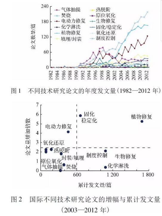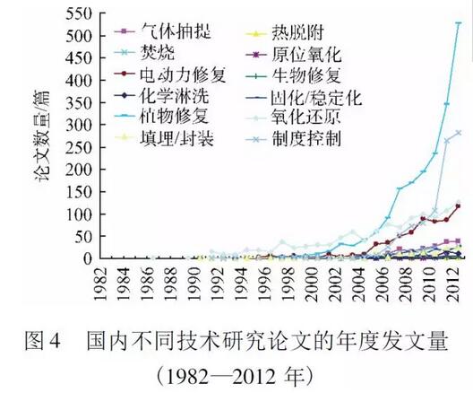 對國(guó)内技術(shù)逐年(nián)的文獻統計(jì)結果來(lái)看(kàn),國(guó)内技術(shù)主要從(cóng)20世紀90年(nián)代開始,先期發展的技術(shù)包括化學淋洗、固定化、氧化/還(hái)原調控等以藥劑研發爲主的技術(shù),以及焚燒、氣體(tǐ)抽提等以設備或工藝引進的技術(shù)。本世紀初,随着國(guó)際植物修複成爲研究熱(rè)點,以及國(guó)内土(tǔ)壤修複相(xiàng)關政策與指導意見(jiàn)的出台,植物修複與制度控制成爲國(guó)内關注的主要技術(shù)。