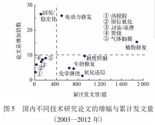 如(rú)圖2所示,基于近10年(nián)的發文量與發文增幅的比較分(fēn)析,植物修複、固化/穩定化、電動力修複是近10年(nián)的新增熱(rè)點;生(shēng)物修複、化學淋洗和制度控制作(zuò)爲傳統修複技術(shù),其論文量增幅不大(dà),但(dàn)累計(jì)發文量較大(dà),說(shuō)明該類技術(shù)一直受到關注。
