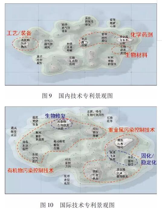 從(cóng)專利景觀圖的分(fēn)布來(lái)看(kàn)(圖10),國(guó)際專利的技術(shù)體(tǐ)系已經成型,基本上涵蓋了有機(jī)污染物降解與重金屬鈍化的主流修複技術(shù),包括傳統的物化技術(shù)和生(shēng)物修複技術(shù),以及新型的有機(jī)污染電動力修複技術(shù)。